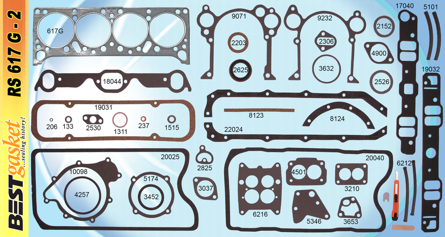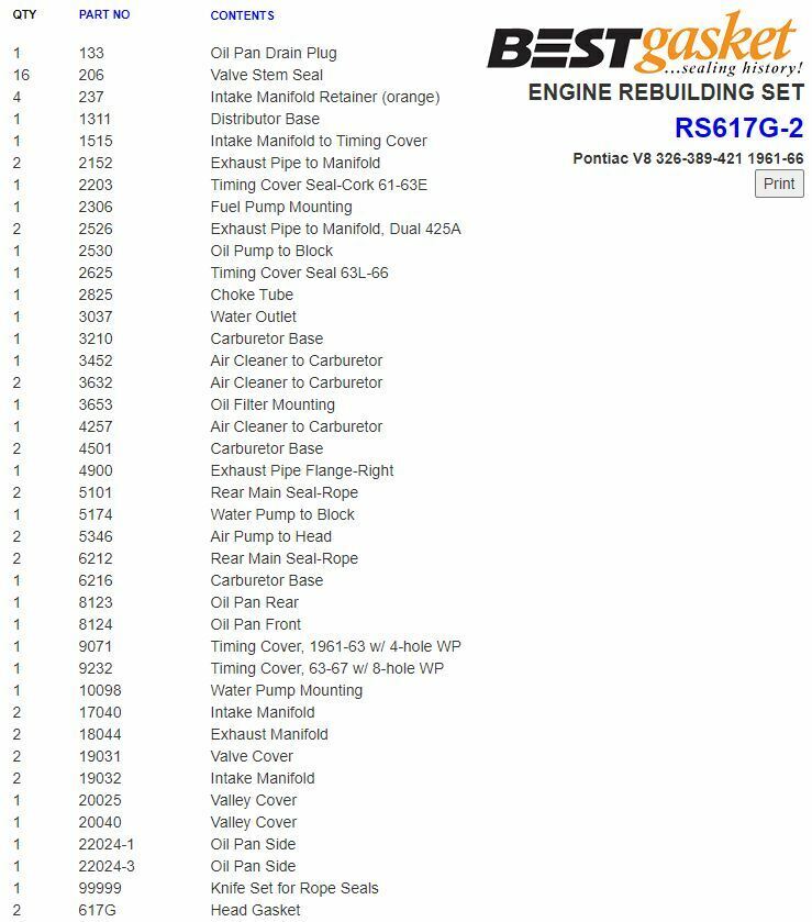 BEST Gasket complete/full gasket set for 1961-67 Pontiac 326ci, 389ci, and 421ci V-8 engines. P/N RS617SA-2. BEST Gasket is the leading name in sealing performance in the restoration industry. Image shown is an actual factory supplied picture showing set contents.