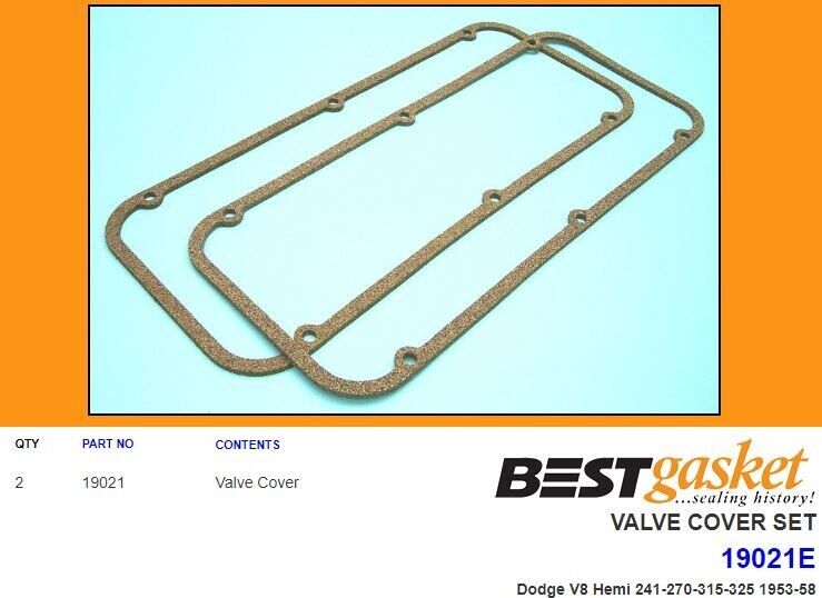 Another great vintage listing from Falcon Classic! This listing is for a BEST Gasket valve cover gasket set for 1953-58 Dodge 241ci, 270ci, 315ci, or 325ci "HEMI" V-8 engines. P/N 19021E.