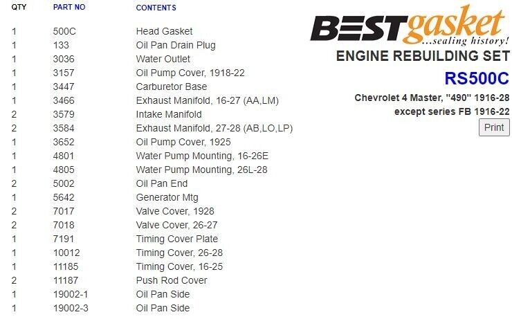 Another great vintage listing from Falcon Classic! This listing is for a BEST Gasket full engine gasket set for 1916-28 Chevrolet Master 490 with the 171ci 4-cylinder engine; except 1916-22 FB-series. P/N RS500C. BEST Gasket is the leading name in sealing performance in the restoration industry. Image shown is an actual factory supplied picture.