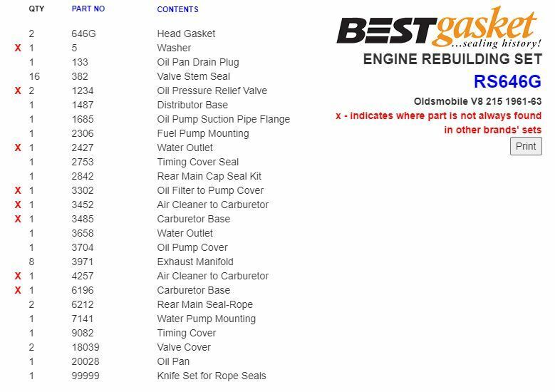 Another great vintage listing from Falcon Classic! This listing is for a BEST Gasket complete engine gasket set for 1961-63 Oldsmobile 215ci V-8 engine; intake valley pan gasket available separately. P/N RS646G. BEST Gasket is the leading name in sealing performance in the restoration industry. Image shown is an actual factory supplied picture showing set contents