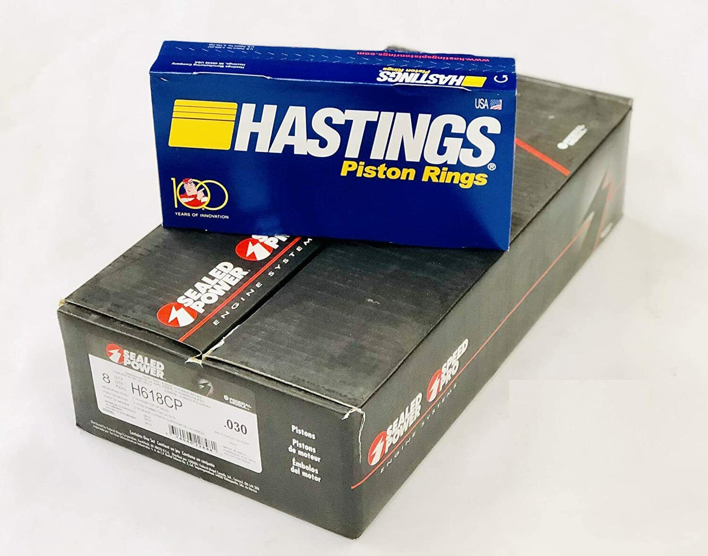This item is for eight (8) .030 over bore Speed Pro (Sealed Power) hypereutectic 3.5cc dome pistons and a moly piston ring set (Hastings/MAHLE) for Chevrolet 350ci (5.7L) small block V-8 engines; Generation I and II engines. P/N (8) H618CP-030 + 2M139-030.
