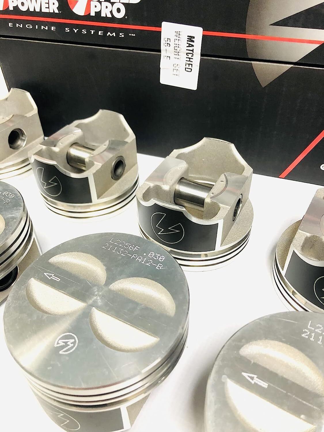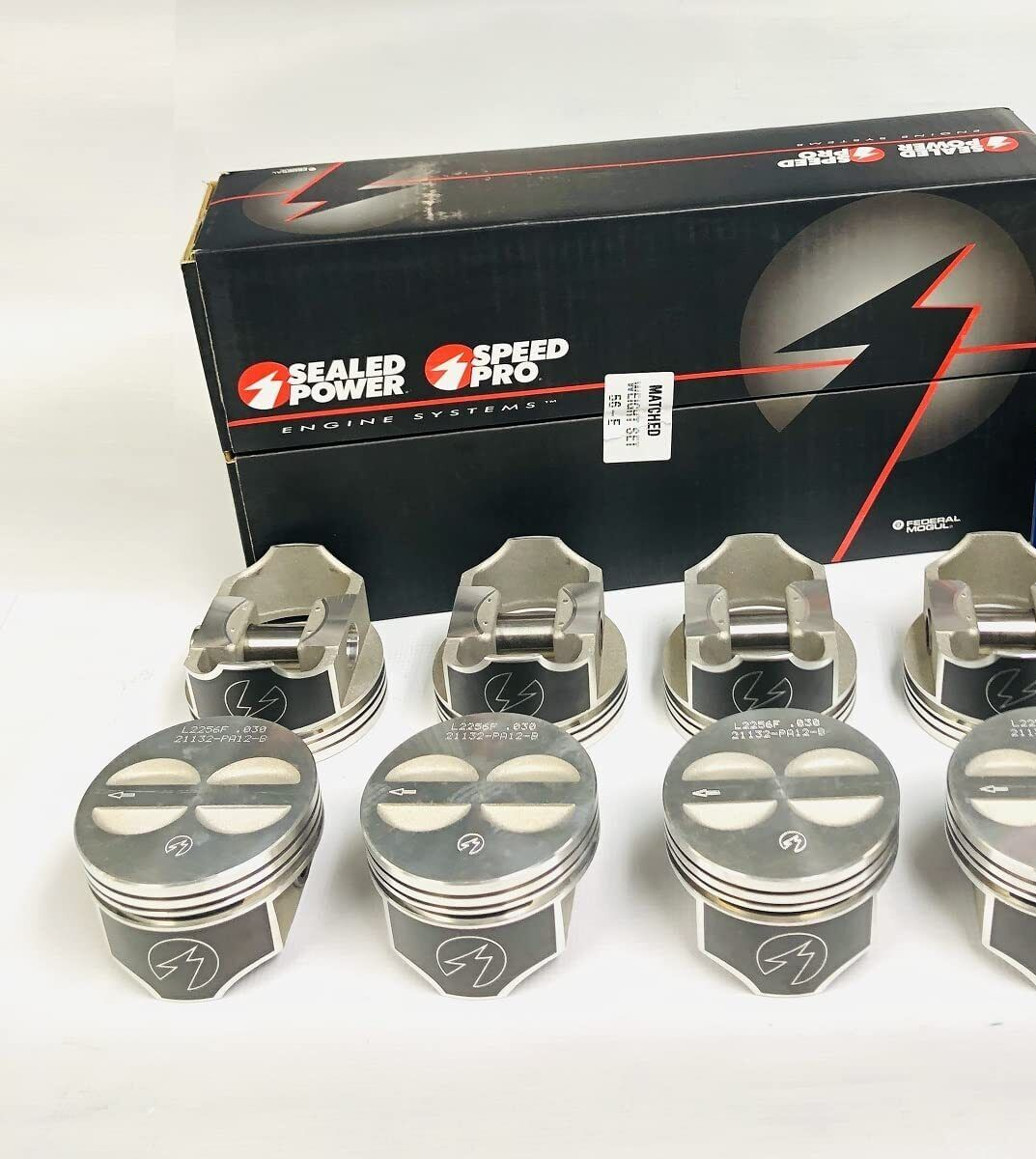 This item is for eight (8) .030-in. over bore Speed Pro (Sealed Power) forged flat top pistons for Chevrolet 350ci (5.7L) small block V-8 engines. P/N (8) L2256F-030. These pistons can be used as a performance upgrade in engines originally equipped with dish top pistons.