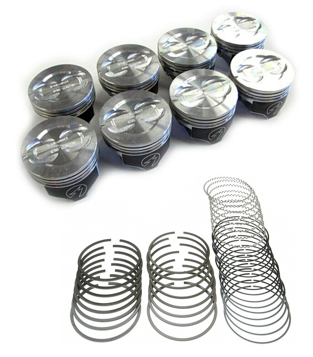 This item is for eight (8) .030 over bore Speed Pro (Sealed Power) hypereutectic dished pistons and a moly piston ring set (Hastings/MAHLE) for Chevrolet 400ci small block V-8 engines using a 5.70-in. connecting rod. P/N (8) H615CP-030 + 2M661-030. These pistons must be used with the longer 5.700-in. length connecting rods.