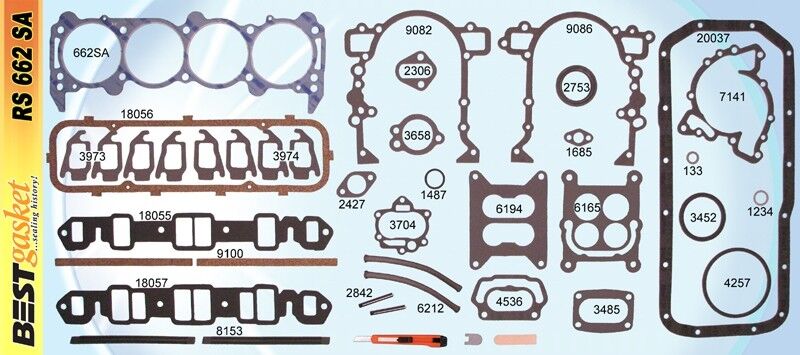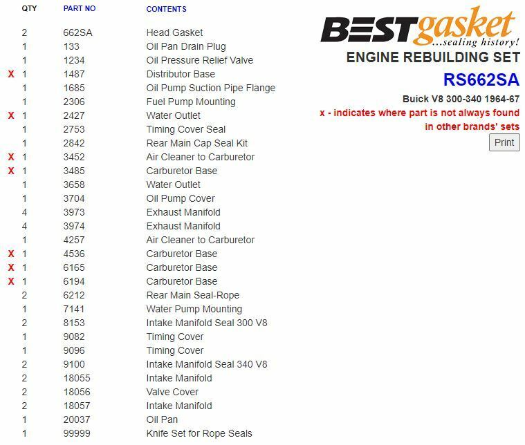 Another great vintage listing from Falcon Classic! This listing is for a BEST Gasket full engine gasket set for 1964-67 Buick 300ci and 340ci V-8 engines. P/N RS662SA. BEST Gasket is the leading name in sealing performance in the restoration industry. Image shown is an actual factory supplied picture showing set contents.