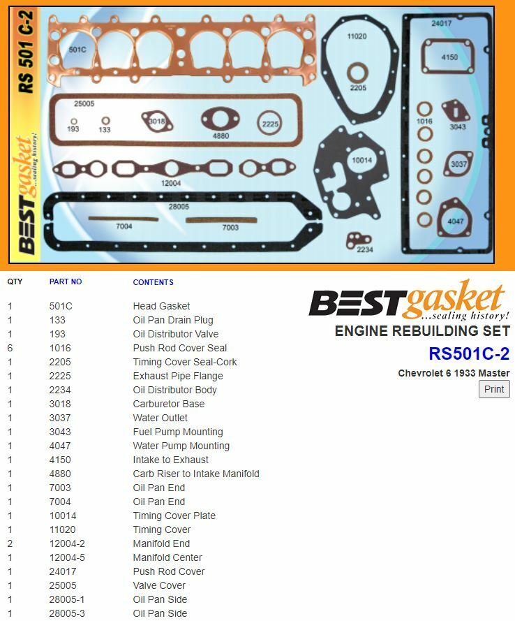 Another great vintage listing from Falcon Classic! This listing is for a BEST Gasket full engine gasket set for 1933 Chevrolet Eagle models with the 207ci "stovebolt" 6-cylinder engine. P/N RS501C-2. BEST Gasket is the leading name in sealing performance in the restoration industry. Image shown is an actual factory supplied picture.
