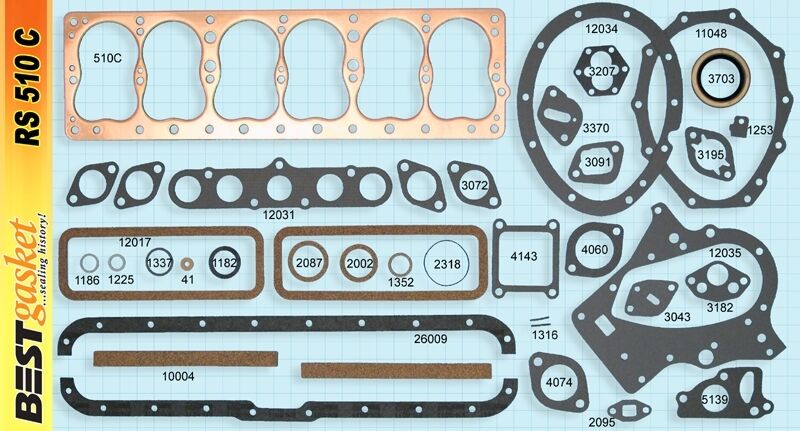 Another great vintage listing from Falcon Classic! This listing is for a BEST Gasket complete/full gasket set for 1937-54 Chrysler and DeSoto models and 1937-68 Dodge truck models using a 218ci, 228ci, 237ci, 241ci, 251ci, or 265ci flathead 6-cylinder engine with a 25" overall length cylinder head. P/N RS510C/4164. BEST Gasket is the leading name in sealing performance in the restoration industry. Image shown is an actual factory supplied picture showing set contents.