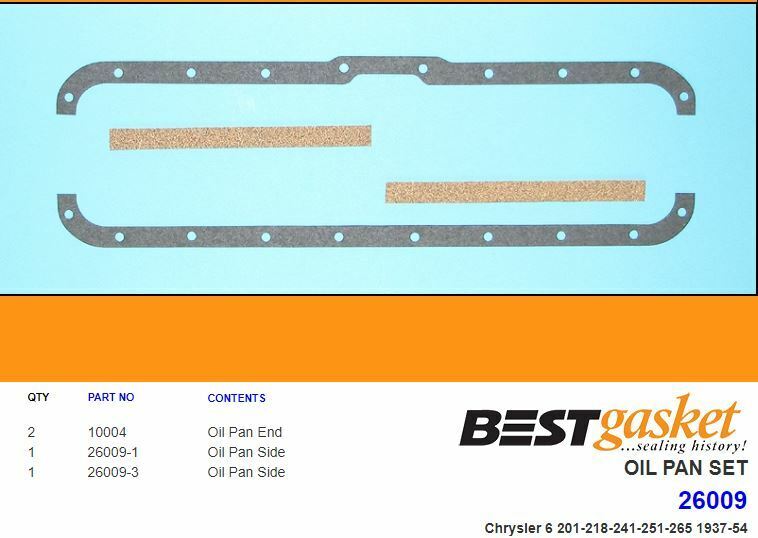Another great vintage listing from Falcon Classic! This listing is for a BEST Gasket oil pan gasket set for 1937-54 Chrysler and DeSoto models and 1937-68 Dodge truck models using a 218ci, 228ci, 237ci, 241ci, 251ci, or 265ci flathead 6-cylinder engine with a 25" overall length cylinder head. P/N 26009. BEST Gasket is the leading name in sealing performance in the restoration industry. Image shown is an actual factory supplied picture.