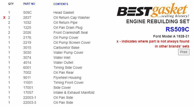Another great vintage listing from Falcon Classic! This listing is for a BEST Gasket complete/full gasket set for 1928-31 Ford Model A 201ci flathead 4-cylinder engine. P/N RS509C. BEST Gasket is the leading name in sealing performance in the restoration industry. Image shown is an actual factory supplied picture showing set contents.