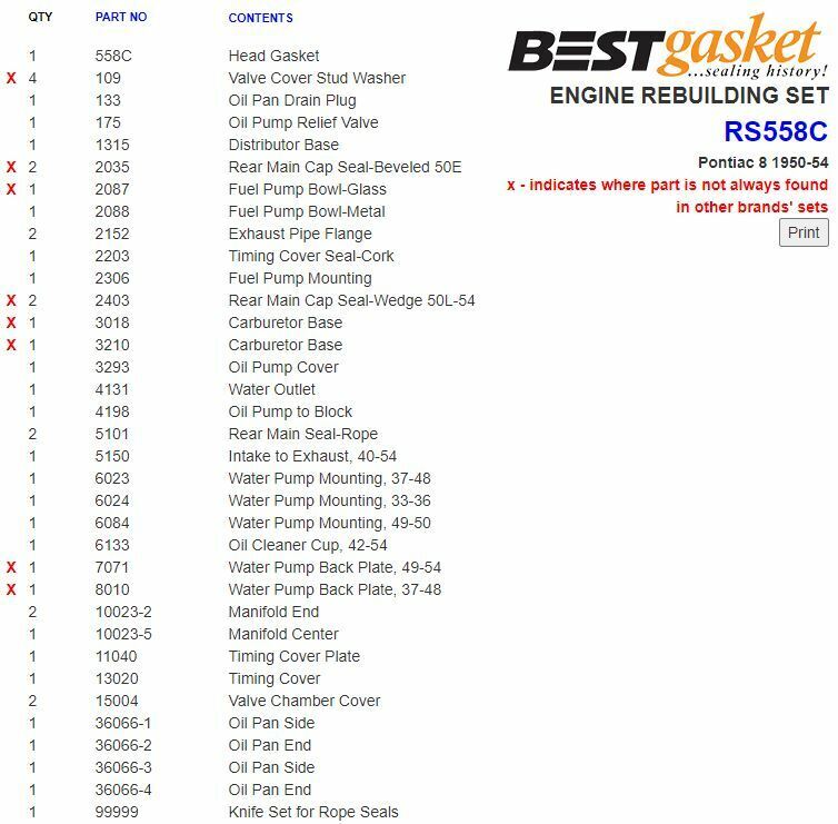 Another great vintage listing from Falcon Classic! This listing is for a BEST Gasket complete/full gasket set for 1950-54 Pontiac 268ci flathead 8-cylinder engines. P/N RS558C. BEST Gasket is the leading name in sealing performance in the restoration industry. Image shown is an actual factory supplied picture showing set contents.