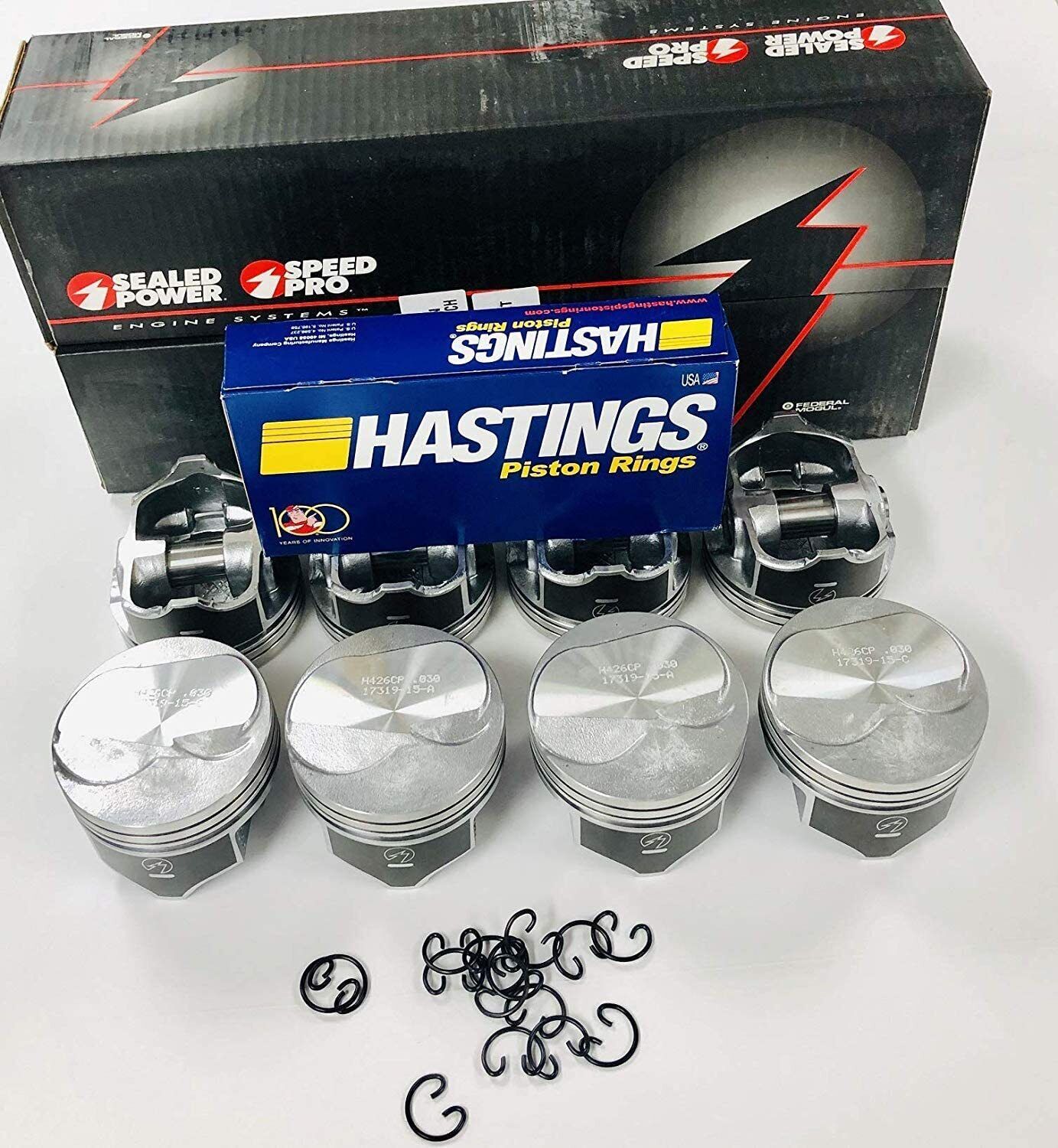This item is for eight (8) .030 over bore Speed Pro (Sealed Power) hypereutectic 10cc dome pistons and a cast piston ring set (Hastings/MAHLE) for Chevrolet 454ci (7.4L) big block V-8 engines. P/N (8) H426CP-030 + 683-030. These pistons are Speed Pro's version of the 1971 LS6 pistons.