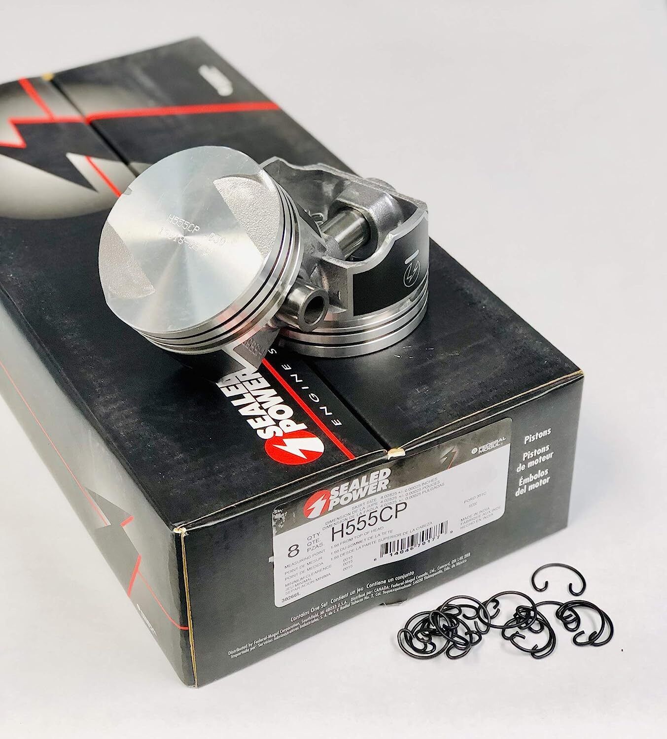 This item is for eight (8) .030-in. over bore Speed Pro (Sealed Power) hypereutectic flat top pistons and a moly piston ring set (Hastings/MAHLE) for Ford 351ci Cleveland V-8 engines. P/N (8) H555CP-030 + 2M139-030. These pistons can be used as a performance upgrade in engines originally equipped with dish top pistons.